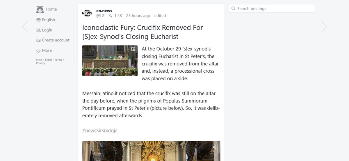 Editor’s Note: The conventical of sin has ended and significantly with a Mass, with the Crucifix removed from the high altar of St. Peter’s. This might mean that they realize that the Synodal Church cannot go “forward” (to Hell) if it rememers what the Crucified did; or, it may mean that the Synod was financed by the World Jewish Congress, which just opened an office at the Vatican and already has a say over the liturgical practices at Saint Peter’s.