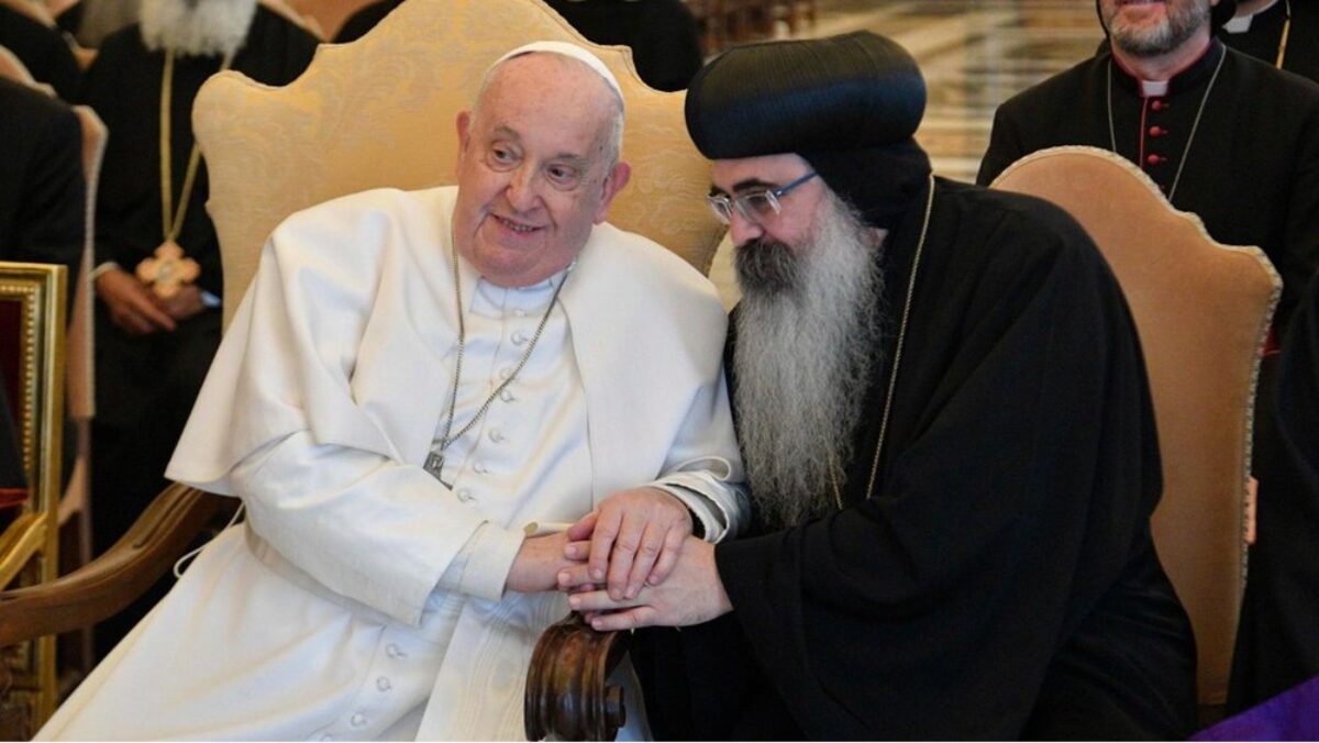 Pope Francis seen during his meeting with the Orthodox Delegation for Theological Dialogue, on Jan. 30, 2024, with a distended face and bloated body. Source @ChristiansMENA