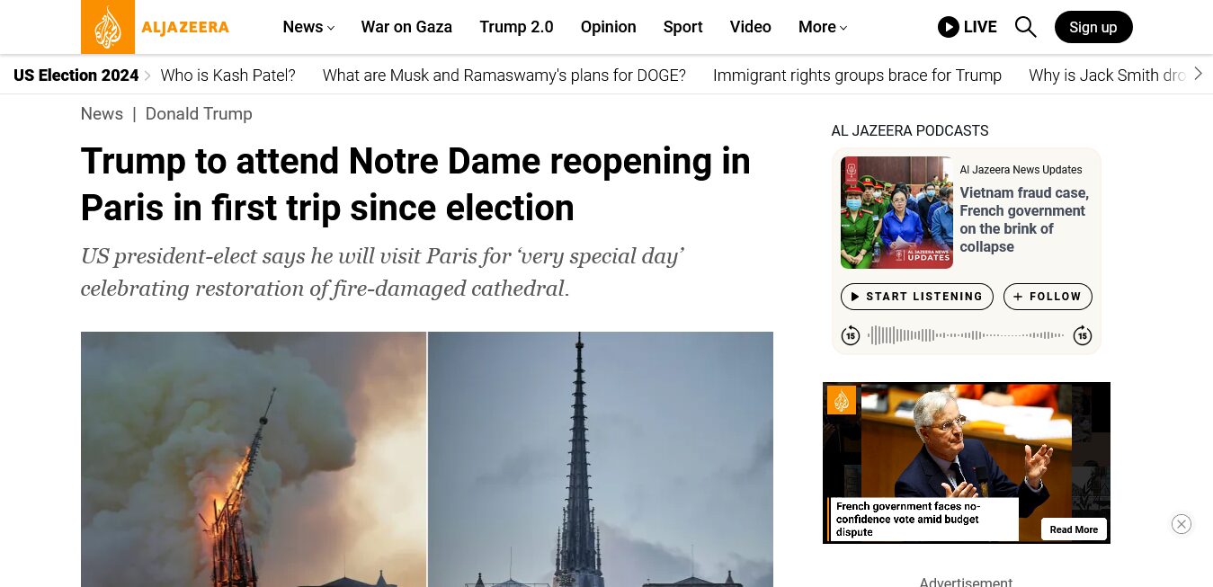 Editor’s Note: What we are seeing here is the perfected theatre of the White and Black Lodges of Freemasonry, with the non-Catholic Trump (Skull and Bones Lodge adept) attending, and the Catholic Pope Francis (Black Lodge, Buenas Aires), refusing. — With Trump declaring the Cathedral is better than it was before [because it has a new dung-colored satanic looking novus Order altar?] Perhaps.