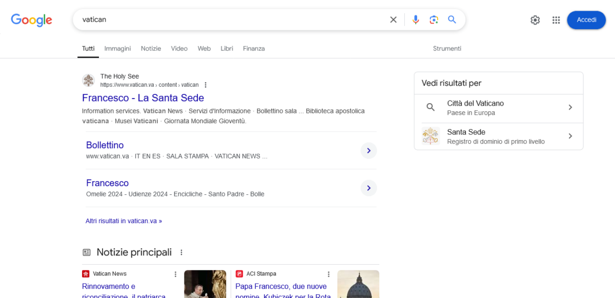 Editor’s Note: I was shocked when I did a search on Google for ‘Vatican”, as the results came up. Not, the Holy See, not the Vatican City State, but “Francesco – La Santa Sede”, that is, “Francis – The Holy See”. Talk about a personality cult!