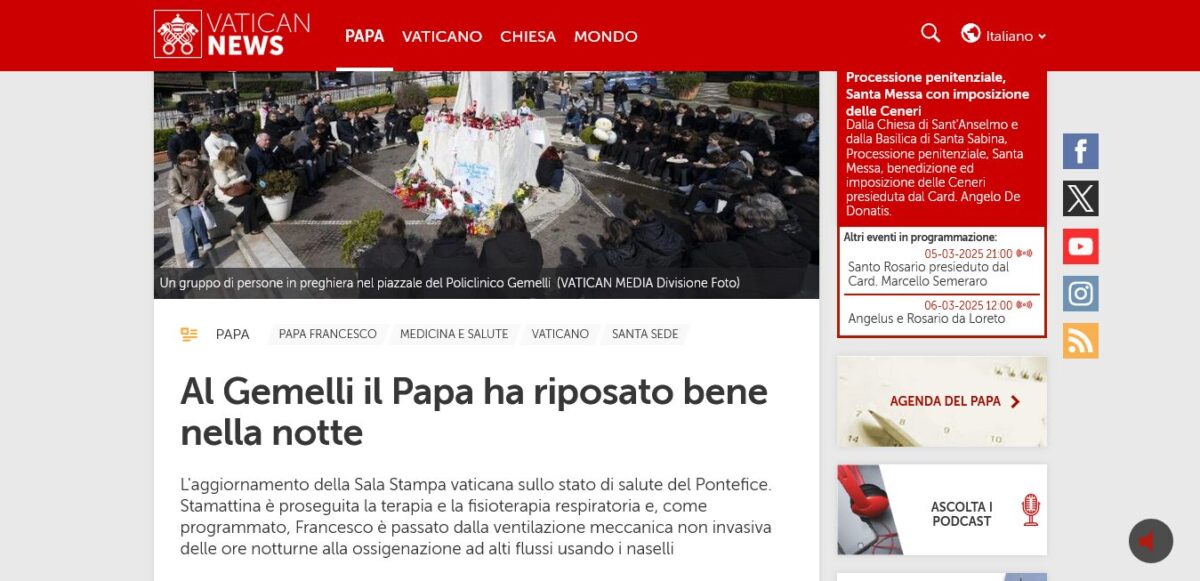Editor’s Note: The only news worthy item in today’s Press Release this morning is that the Pope’s condition “appears to be stable”, in the context of a complex medical situation. They still have not said what that is, however. But it is noteworthy that they are no longer saying emphatically that his condition is stable. And that implies they know he is not only not improving, but not making any lasting improvement. It also means that whatever are the results of his blood, urine, and other tests, his doctors no longer see improvement or no longer consider them to regard what are his critical issues.
