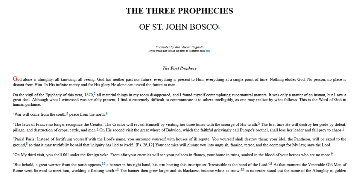 Saint John Bosco, the founder of the Salesians, who care for orphaned youth, was given special graces to assist the Popes govern the Church. His personal influence over certain key members of the Masonic Kingdom of Italy, allowed Pope Pius IX to re-appoint Bishops in Italy again, for example. But among these graces, Saint John Bosco also had a number of mystical visions.