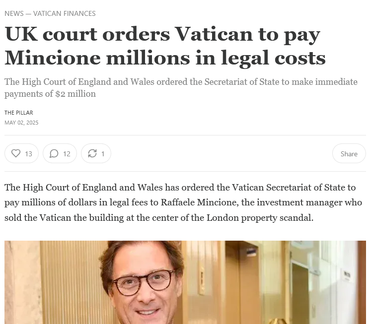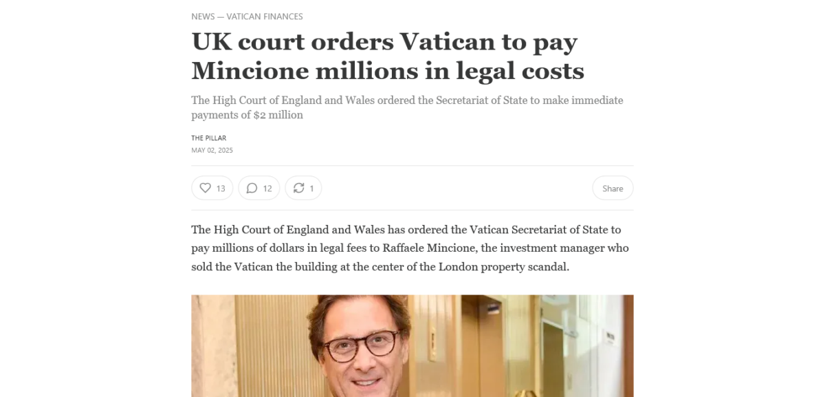 Editor’s Note: This article is worth reading to understand just how incompetent and reckless was Cardinal Parolin and his subordinates in the Vatican’s Secretariat of State when making investments. And how they entrusted vast sums to be managed by laymen, with apparently no oversight or vetting. I agree with Mincione when he says the Vatican officials were grossly incompetent.