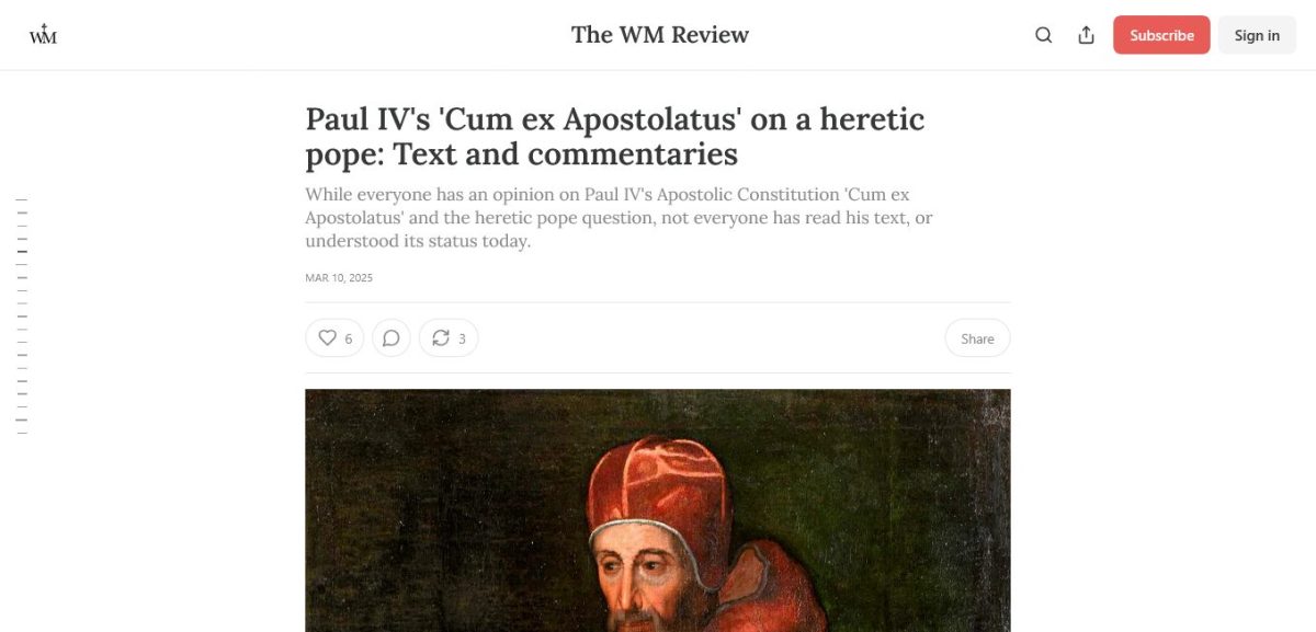 Here, in the above article by The WM Review, there was published back on March 10, 2025, an unsigned article discussing Pope Paul IV’s Constitution “Cum ex apostolatus officio”, of Feb. 15, 1559 A. D. You can find the Latin text and my new translation, HERE. You can find other translations HERE.