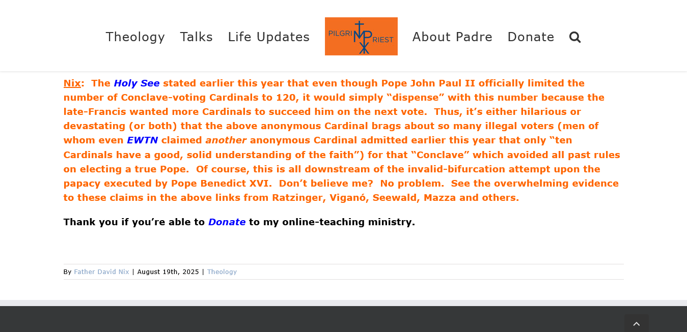 Editor’s Note: In the above article, there is a passage which links to me, under the words, “Boomer Catholic”, with no social media following, who supports the heresies of Cardinal Prevost: