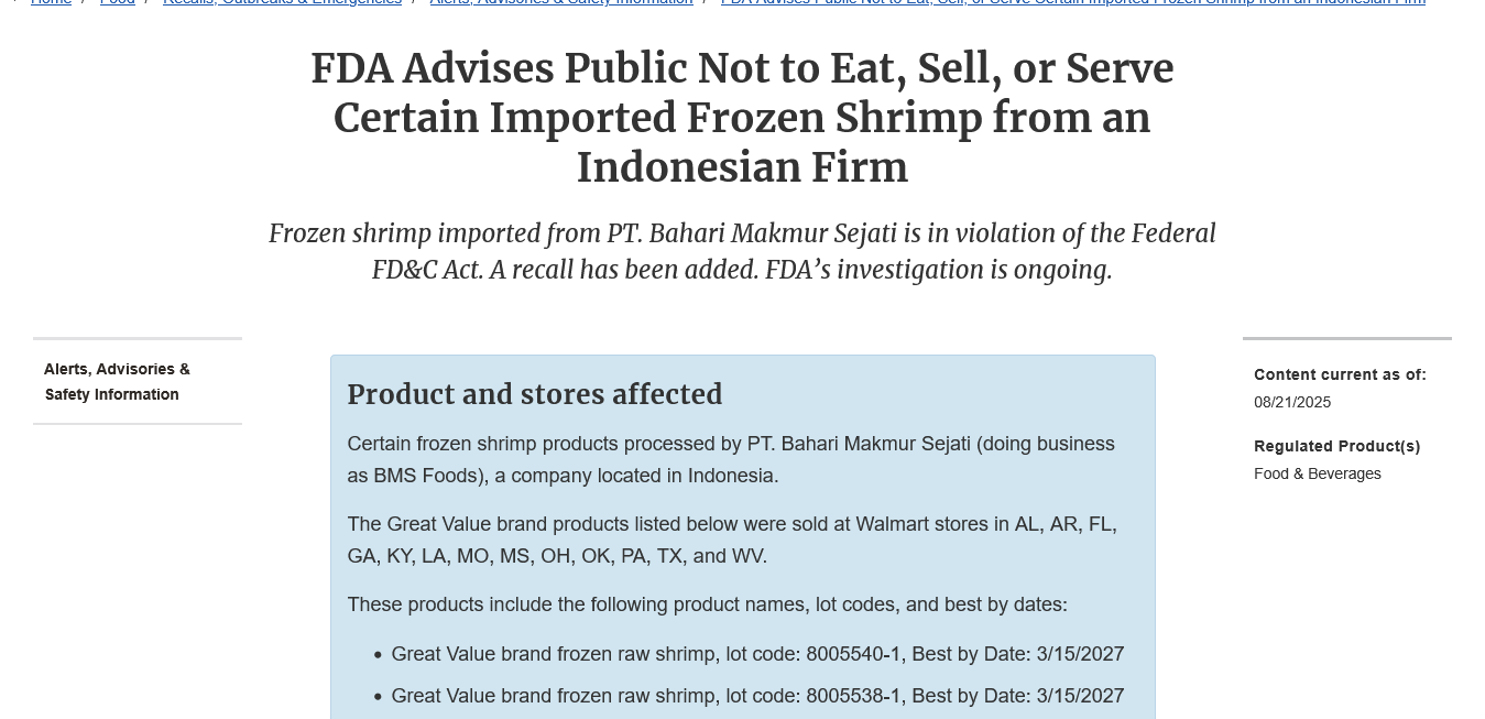 USA: FDA warns public of Indonesian Shrimp contaminated with Radioactive Cesium
