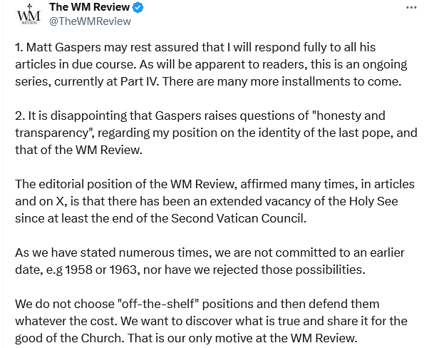 You can see the whole import of The WM Review, from what they do NOT do. They don’t want to find the truth of how the Conclave of 2025 was invalid and how the right to election the pope has passed to the Catholics at Rome because of the de facto unanimous forfeiture by the College of Cardinals (cf. Save Rome Project). That truth, they do not want to find on their own and tell the Church for the good of souls.