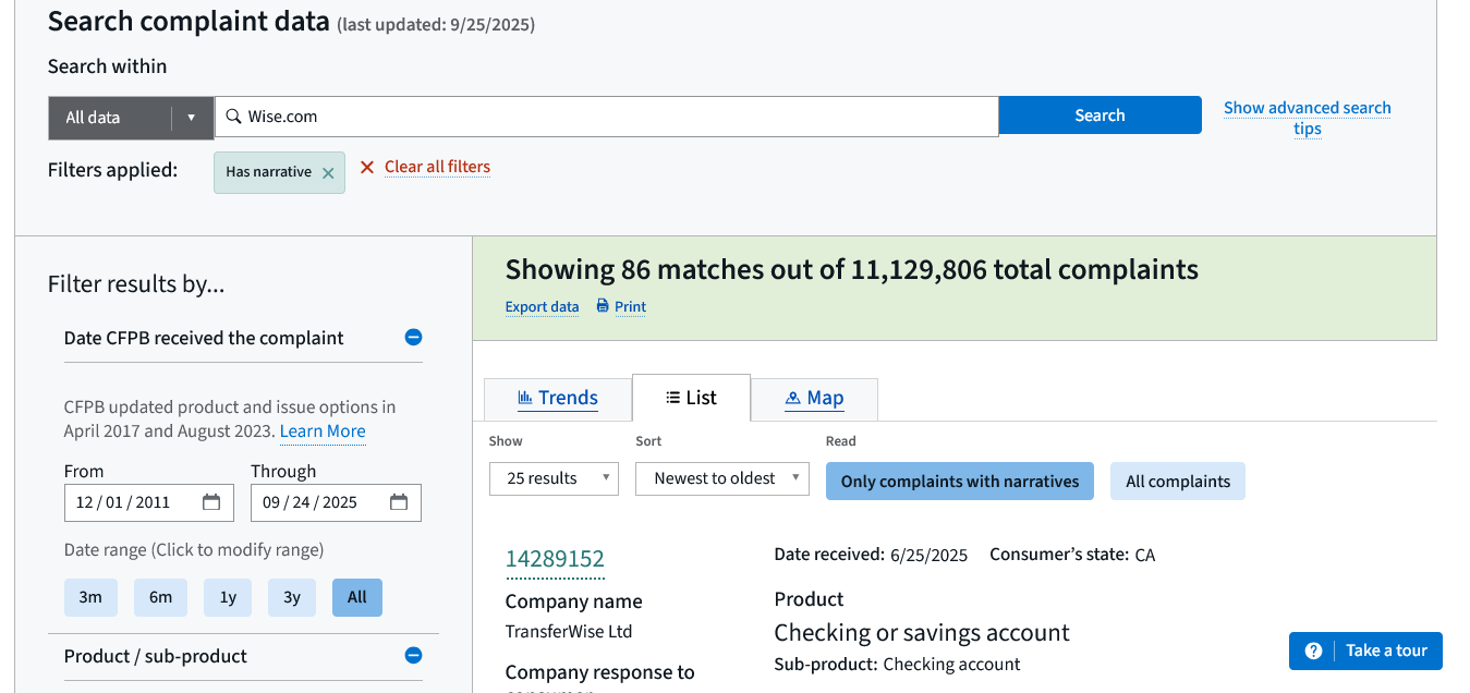 Editor’s Note: The United States Consumer Financial Protection Bureau has an extensive searchable database for complaints filed by consumers against corporations which are regulated Financial Institutions or Transfer companies. Wise.com is one of these.