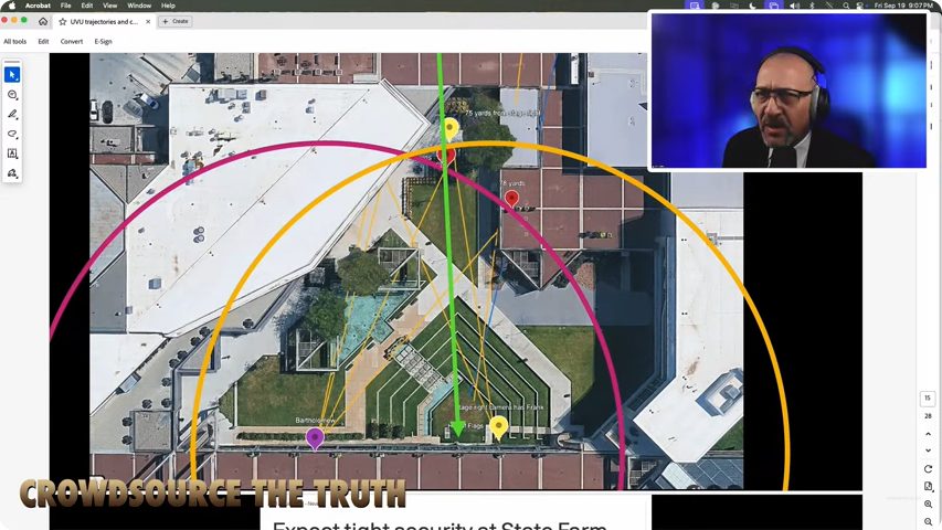 However, after the 16:00 mark, they begin a discussion about the acoustic analysis and the distance to the shooter from various cameras which were running at the time of the shooting, and they identify a drone which was in that position at the time of the Assassination. — In the image below, the intersection of the circles and lines where the shooter or drone was. It was not Tyler Robinson on the roof of the Losee Center. — Then they discuss whether there are two shooters, how electronic warfare was used to end live-streamers of the event one minute before the shooting, and a discussion of the planes which were in the air at the time.