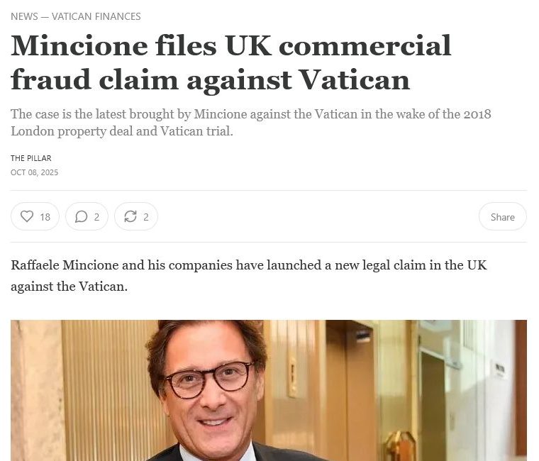 Editor’s Note: If any reader of FromRome.Info practices law in the United Kingdom, he should inform Mincione’s lawyers, that he can add another fraud charge to his lawsuit, namely, that the Vatican represented to him that the administration of Pope Francis was a legitimate government of the Vatican, when in fact, Pope Benedict XVI was still the pope and every legal act by Francis’ cronies was illegal and criminal fraud. Because a future Catholic pope will declare it such, and then Mincione will find out how he was caught up in the fraud committed against the whole Church by the illegal Conclave of 2013. In fact, he can name all the Cardinals as co-defendents and seek reparations from them too, since they are prime actors in the fraud which has been going on since 2013.