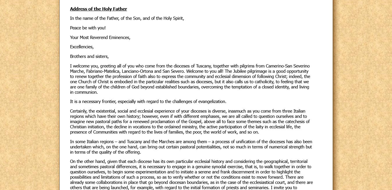 Dear friends, some of the urgent pastoral and social matters on which I have wished to dwell, albeit in different ways and according to different priorities, affect all the local Churches and call every one of our Christian Communities to a reawakening of evangelization and a discernment on the forms of ecclesial presence in the territory. Don Lorenzo Milani, prophet of the Tuscan and Italian Church, whom Pope Francis defined as “a witness and interpreter of social and economic transformation” (Francis, Address to members of the Committee for the centenary of Don Lorenzo Milani, 22 January 2024), had as his motto “I care”, that is, “It matters to me, I am interested, it is close to my heart”. I urge you not to be passive, and to do your part to shape the face of a Church that cares about people’s lives, and especially the poorest.