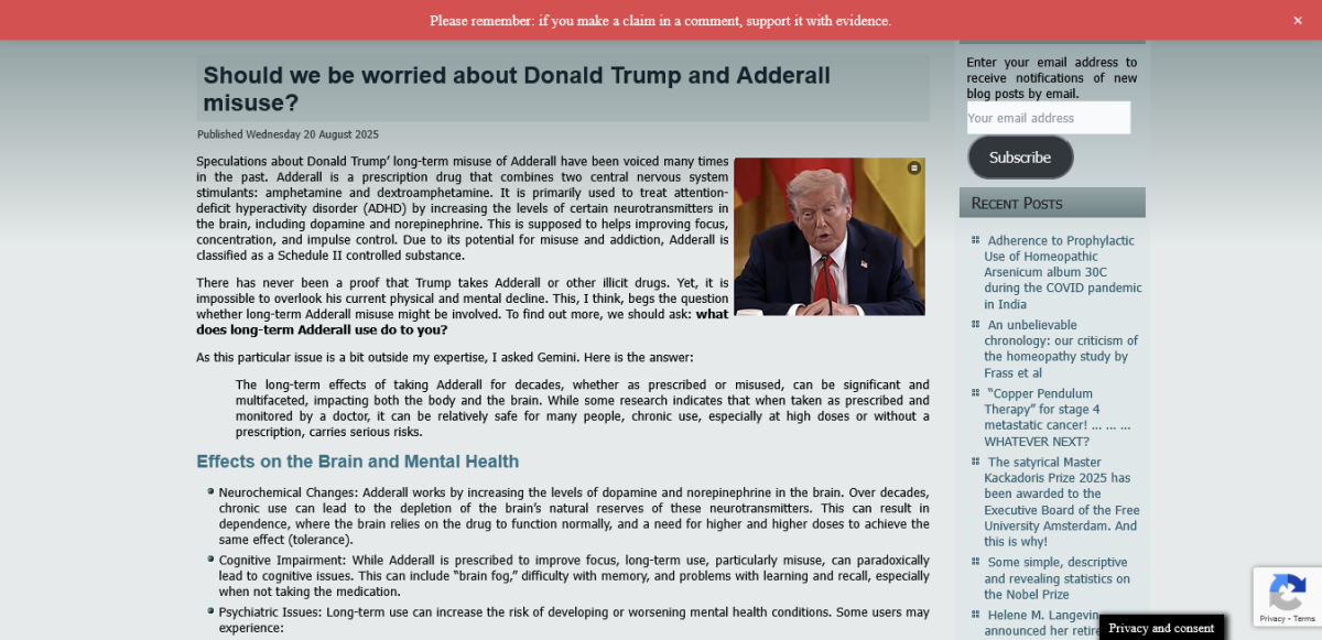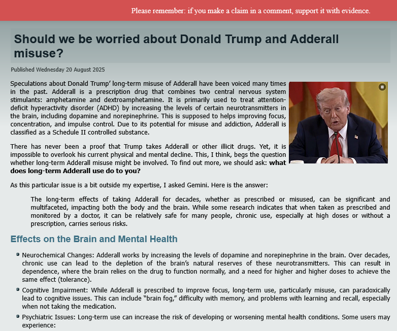 I chronicle the news of the events of our times. That does not mean that the posts I share express views that I agree with. I am not a doctor. I have seen Trump’s erratic behavior. And it is widely reported he is taking Adderall. So I share a link to this article, recently published. It does not matter, on account of my criteria as a chronicler, who the author is.