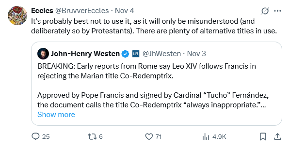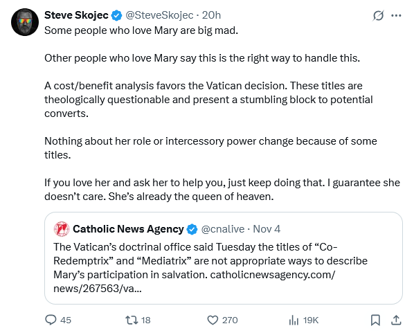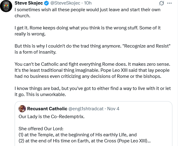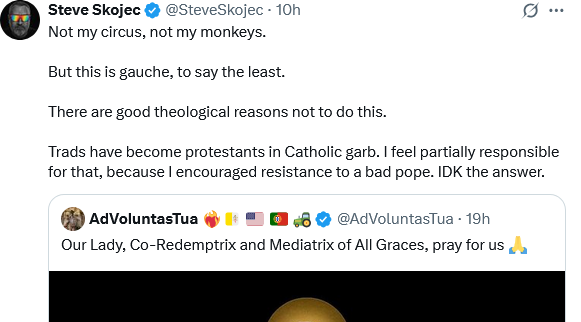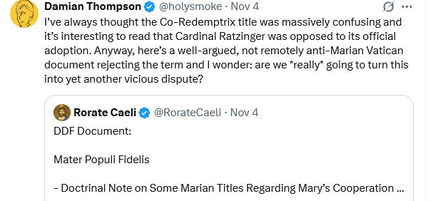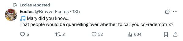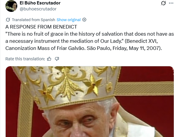 On Twitter (X), the “Catholic” influencers who virulently opposed arguments, facts, and laws which demonstrated that Pope Benedict XVI was the true pope until death, are taking their masks off and publicly denying in one way or another Our Lady’s titles as Corredemptrix, Mediatrix etc..