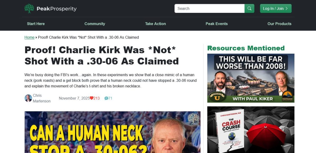 Editor’s Note: A lot of talking heads and former U.S. Military have discussed this matter for two months, but Peak Prosperity did a rigorous test of the trajectory, ballistics, target etc.. This is by far the most definitive investigation yet, and it, as so many other facts, disproves the official narrative, which claims that Tyler Robinson with a Mauser ’98, shot Charlie Kirk with a .30-06 round from the top corner of the Losee Building, at Utah Valley University, on September 10, 2025, at 12:23 P. M., local time.