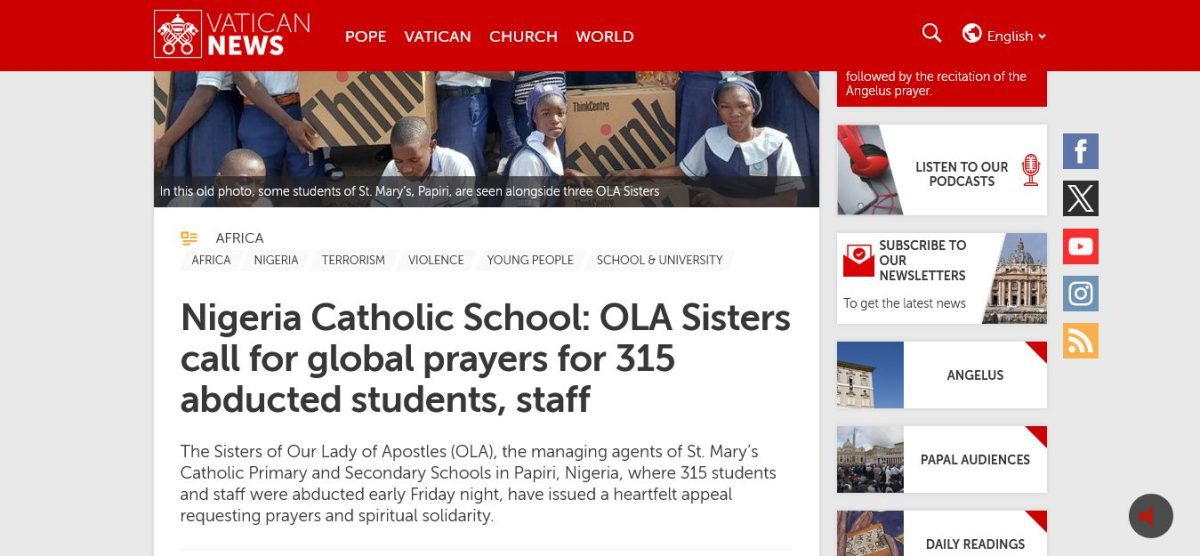 Editor’s Note: I have mentioned before, how Islamic Terrorism in West Africa is an operation of French Military intelligence to force those governments to buy military hardware from France or the U.SA.. Thus, that 315 Catholics should be kidnapped, in one of the largest kidnappings in the history of Nigeria, AFTER Donald Trump spoke of possible military intervention in that country, is NOT a coincidence. — That Robert Prevost was named by the Haverford College’s online newsletter in May as someone who joined the CIA while a student there in the 70s, has everything to do why the Vatican News all of a sudden as taken interest in terrorism in Nigeria.