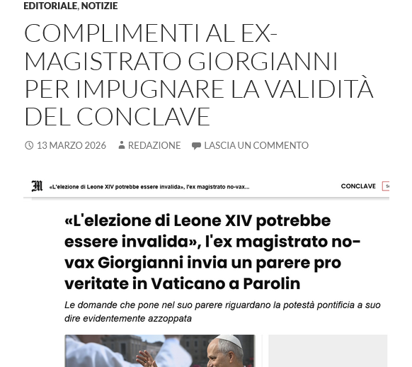 Our editorial staff commends former magistrate Angelo Giorgianni for calling into question the validity of the May 2025 Conclave in his recent missive to Cardinal Parolin. He did so on the grounds of an evident violation of *Universi Dominici Gregis* No. 33, which—in its official Latin text—prescribes a maximum of 120 Cardinal electors. The validity of his argument, and the threat it poses to the globalist narrative, is evident in the fact that *Il Messaggero* attempts to smear his reputation in the editorial accompanying its article of March 12, 2026, labeling him a “no-vaxxer.” We do not know, however, whether he intends merely to embarrass the criminal conspirators within the Vatican by submitting a legal inquiry regarding the Conclave’s validity, or whether he is seeking the publicity that Italian newspapers have denied to these issues since May 2025. Certainly, however, we cannot expect an ecclesiastical mafia—comprising sexual perverts and Freemasons—to explain why they have erred. Indeed, the author of the aforementioned article (linked above) finds nothing to say other than to reiterate the outrageous fraud perpetrated by them on April 30 of last year. The day prior, Archbishop Viganò himself had asserted that the Conclave would yield no legitimate result—comments evidently based on his intimate knowledge of individuals within the Secretariat of State. It remains, however, that the Faithful—the clergy, religious, and laity of our Apostolic Church—possess the integrity and simplicity to exercise the right granted to them by Pope John Paul II in the aforementioned law (paragraph 76), which declares that any Conclave conducted in a manner other than that prescribed confers no rights upon the person elected, and that no specific authority is required to declare it invalid. In this regard, the initiative undertaken by the courageous Giorgianni is flawed. In the meantime, we invite the faithful to support the true Holy Father Ildebrando in his Lenten Campaign, so that he may have the necessary funds to open a parish for true Catholics here in Rome. You can make a donation via PayPal, Stripe, Apple Pay, and Google Pay through this LINK. Thank you!